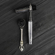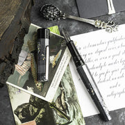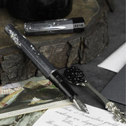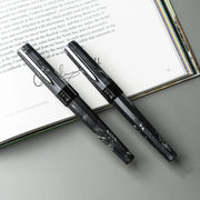 This fountain pen features a high-quality, German-made stainless steel #6 nib and comes with a standard international converter and one long blue ink cartridge. You can also convert it to eyedropper fill.