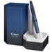 The Pilot Capless 2025 Limited Edition Link Midnight Fountain Pen showcases a rich midnight-blue barrel adorned with a textured metallic pattern influenced by Guilloche engraving and modern mesh textiles. Its tactile surface subtly reflects the light, while matte black accents and a smoky black ion-plated 18k gold nib provide the pen with a sleek and refined elegance.