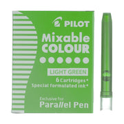 Specifically designed for the Pilot Parallel pens. When used with a second pen, you can achieve gradated color variation with these mixable inks. This box includes 6 fountain pen ink cartridges in light green.