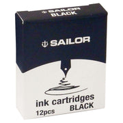 This pack of 12 cartridges is specifically formulated for Sailor fountain pens and is proprietary in size. This smooth-flowing ink is safe for your Sailor fountain pens and is an averagely deep black ink but does exhibit a small amount of shading, particularly in broader nibs.