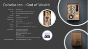 Daikoku-ten is a syncretic god, conflated from the Buddhist deity Mahesvara (the Hindu deity Shiva) and the indigenous Shinto god Okuninushi-no- Mikoto. In ancient times, Daikoku-ten was worshipped as the god who controlled the earth - specifically farming - and ruled food and wealth. Today, Daikoku-ten is worshipped as the god of riches, as well as happiness, prosperity, and better fortune.