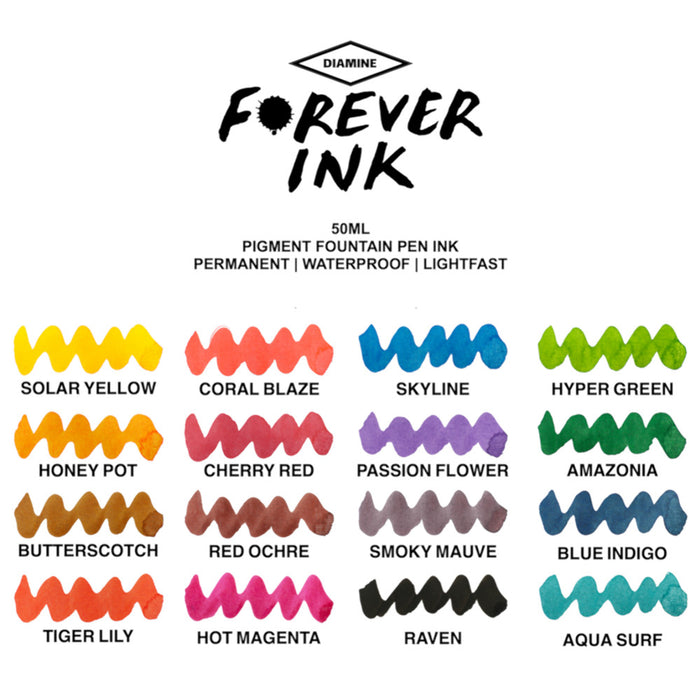 The much anticipated permanent fountain pen ink from Diamine Inks has officially arrived. Complete with 16 new colours, these inks are sure to inspire writers and artists from across the globe. Crafted with the highest quality pigments, this innovative formula makes Diamine's Forever Ink also perfect for brushes, dip pens and calligraphy pens. Use alone or layer up with our dye-based range without fear of bleeding. This ink offers permanent, waterproof, and lightfast qualities.