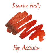 Diamine Firefly from the 2017 Shimmertastic collection is a vibrant orange-red fountain pen ink with low shading and gold shimmer. It dries in 40 seconds in a medium nib on Rhodia and has an average flow.