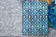 The Paperblanks Blue Velvet design is inspired by a piece of a 15th-century velvet dalmatic. It is decorated in brocaded gilt metal thread with a seven-lobed shield, an artichoke-like botanical shape and tiny floral patterns.