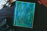 Our oceanic blue Verne, Twenty Thousand Leagues design features Vernes handwritten draft of Twenty Thousand Leagues Under the Sea. The back of the journal features an engraving depicting Captain Nemo observing a squid of colossal dimensions.