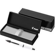 This dramatic black and white version of Pilot Vanishing Point fountain pen has a matte white barrel with black accents. This fountain pen comes with a retractable black ionized 18k gold nib - just click to expose or retract the nib. One of the features that make the Pilot Capless Vanishing Point a truly great pen is the inventive little trap door that closes to keep the nib from drying out. It is truly an engineering marvel. A Pilot CON-40 converter is , of course, included with this pen, as well as a Pilot ink cartridge. Each Capless fountain pen is beautifully merchandised in a black gift box.