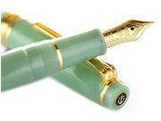 This Sailor Pro Gear Slim Dragon Palace fountain pen features a glittering mint pastel green resin barrel and cap, complemented by gold-plated accents. This is one of four colors as part of Sailor's Shikiori Special Edition Japanese Fairy Tale collection. The flat top cap features the Sailor anchor logo inset into the top finial. It comes equipped with Sailor's legendary 14kt yellow gold nib in medium fine. The cap screws to open/close and can push to post onto the back of the barrel when writing. The Professional Gear Slim fountain pen comes with a Sailor proprietary converter as well as two proprietary Sailor Black ink cartridges.