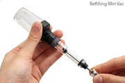 - Unscrew the translucent colored cap if filling a Vac Mini and both the colored cap and the gray plastic adapter if filling a Vac700.